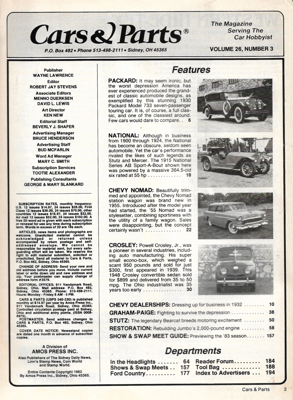 Reviews CARS & PARTS 1983 MAR - '30 PACKARD 733, '15 AB SPORT-A-BOUT, '48 CROSLEY