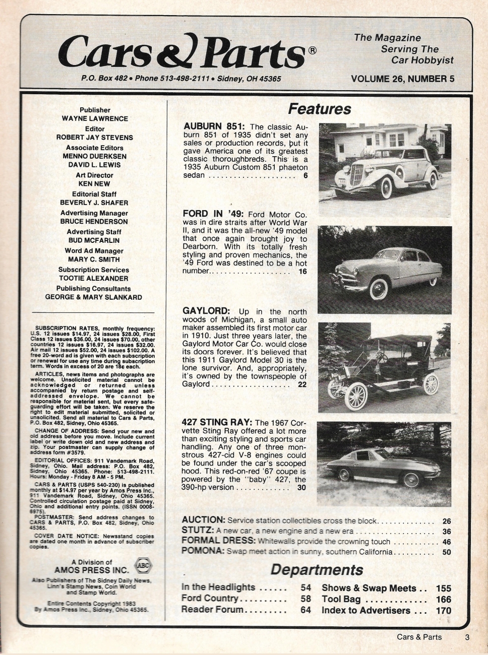 Reviews CARS & PARTS 1983 MAY - '49 FORDS, 427 VETTE, '35 AUBURN PHAETON, STUTZ