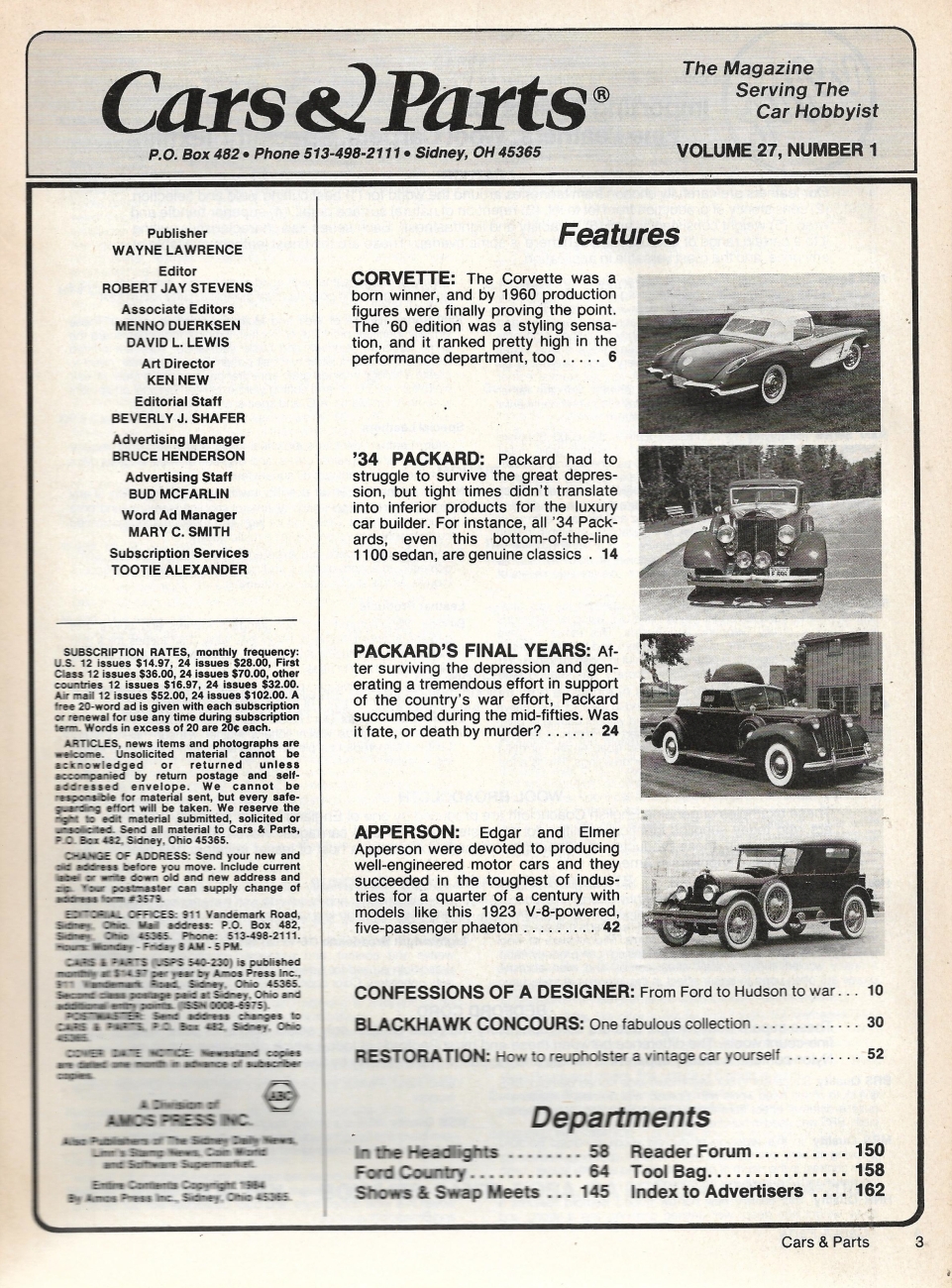 Reviews CARS & PARTS 1984 JAN - '60 CORVETTE, '34 PACKARD, APPERSON JACK RABBIT CAR