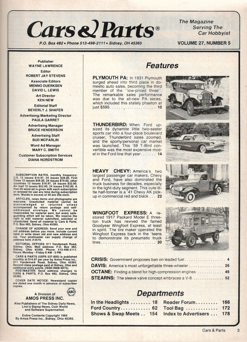 Reviews CARS & PARTS 1984 MAY - 3-WHEEL DAVIS, '59 T-BIRD CONV, '41 CHEVY P/U
