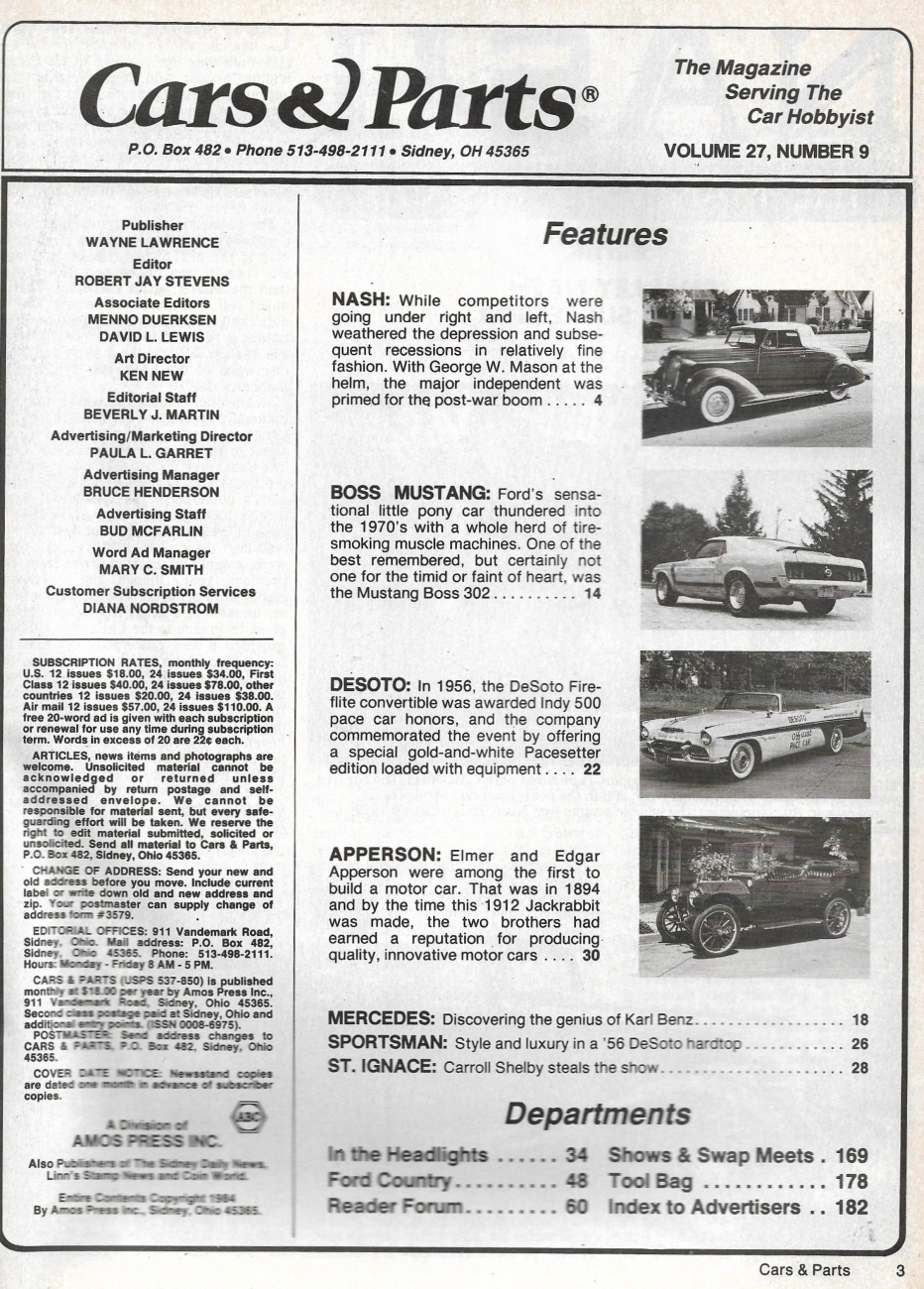 Reviews CARS & PARTS 1984 SEPT - '70 BOSS MUSTANG, NASH, DESOTO '56 PACE/SPORTSMAN