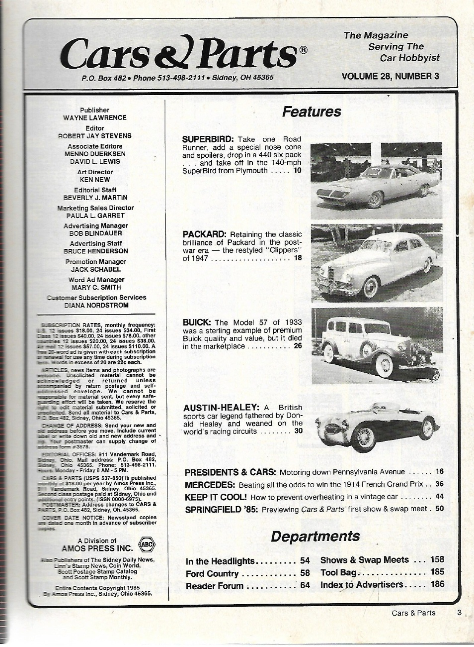 Reviews CARS & PARTS 1985 MAR - AUSTIN-HEALEY, '47 PACKARD SEDAN, '33 BUICK 57,'70 BIRD
