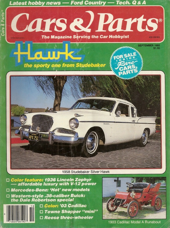 Reviews CARS & PARTS 1985 SEPT - 58 SILVER HAWK, 58 BUICK LTD, NEW MERCEDES