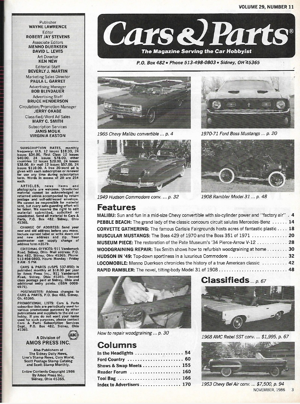 Reviews CARS & PARTS 1986 NOV - BOSS MUSTANGS: 429, 351, LOCOMOBILE, '08 RAMBLER
