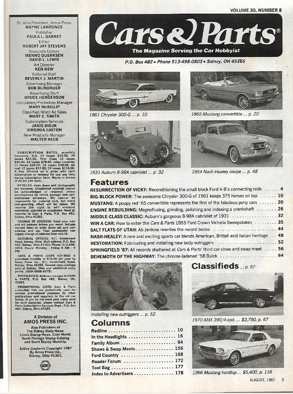 Reviews CARS & PARTS 1987 AUG - '65 FORD MUSTANG, '54 NASH, VICKY, '31 AUBURN