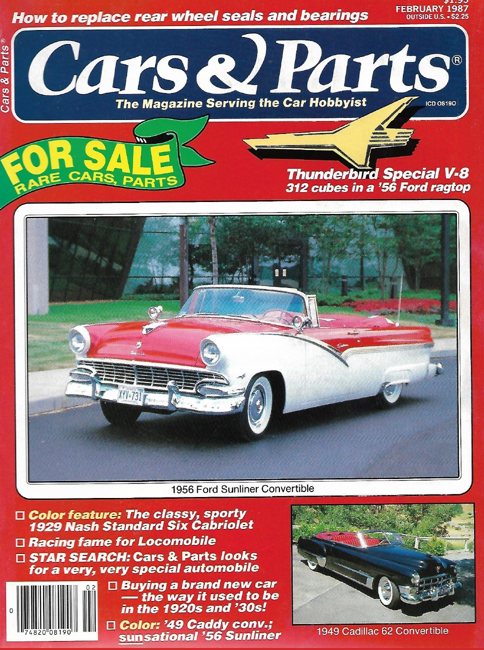 CARS & PARTS 1987 FEB - '56 FORD SUNLINER CONV, '29 NASH, LOCOMOBILE, '49 CADDY