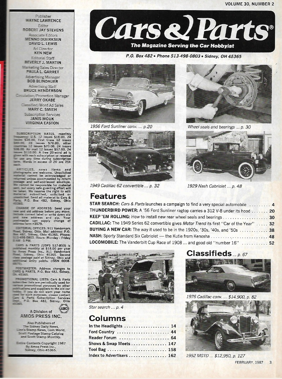 Reviews CARS & PARTS 1987 FEB - '56 FORD SUNLINER CONV, '29 NASH, LOCOMOBILE, '49 CADDY