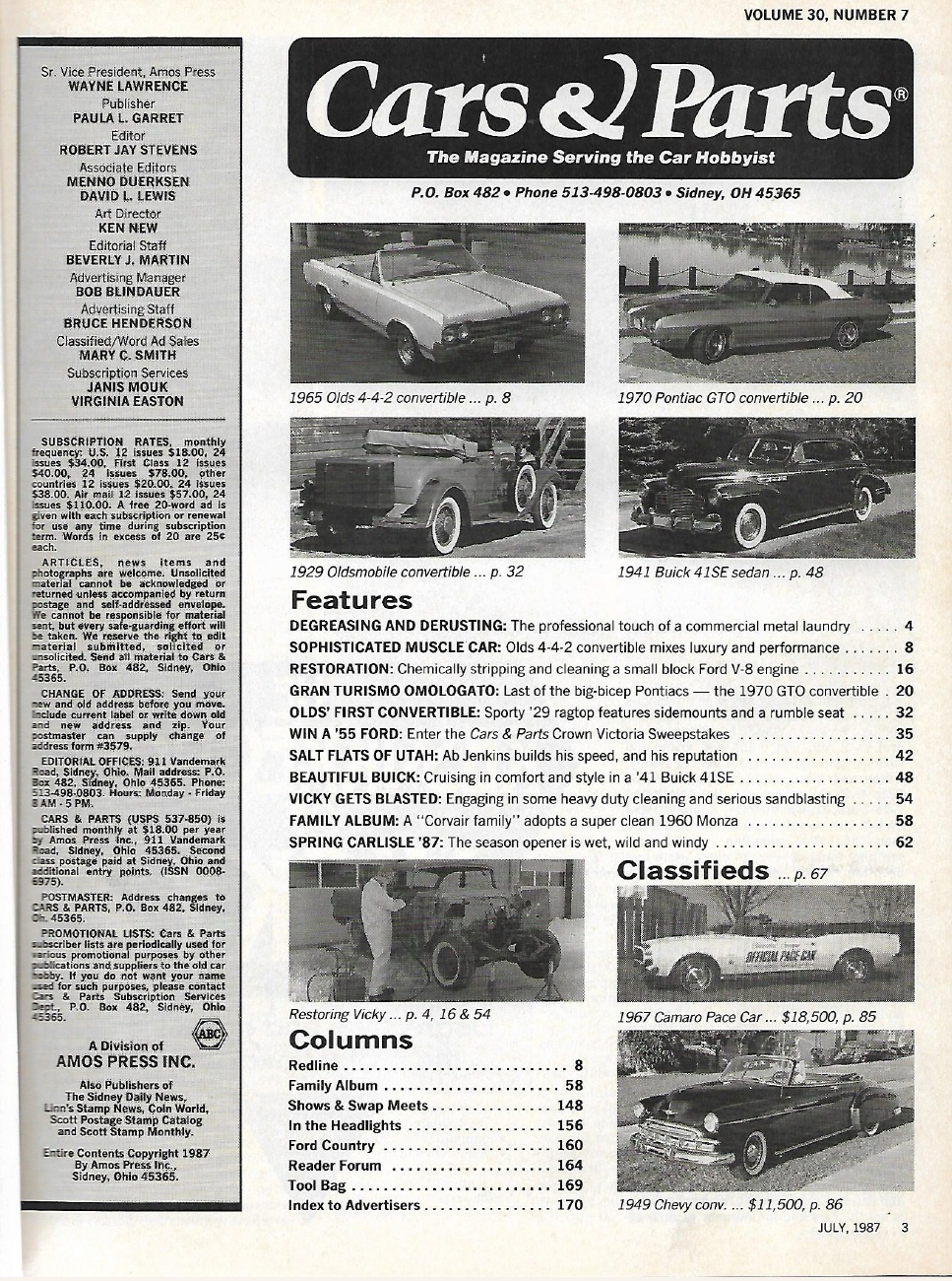 Reviews CARS & PARTS 1987 JULY - VICKY PROJ CAR, '41 BUICK, '60 CORVAIR MONZA, '29 OLDS