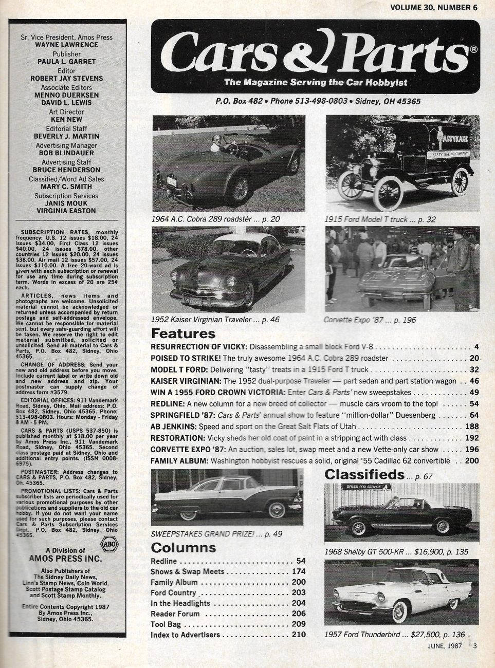 Reviews CARS & PARTS 1987 JUNE - COBRA A C 289, '15 MODEL T BAKERY TRUCK, '52 KAISER