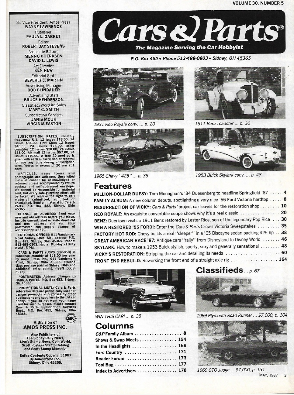 CARS & PARTS 1987 MAY - '31 REO ROYALE, '11 BENZ, '53 SKYLARK, VICKY: PROJ CAR