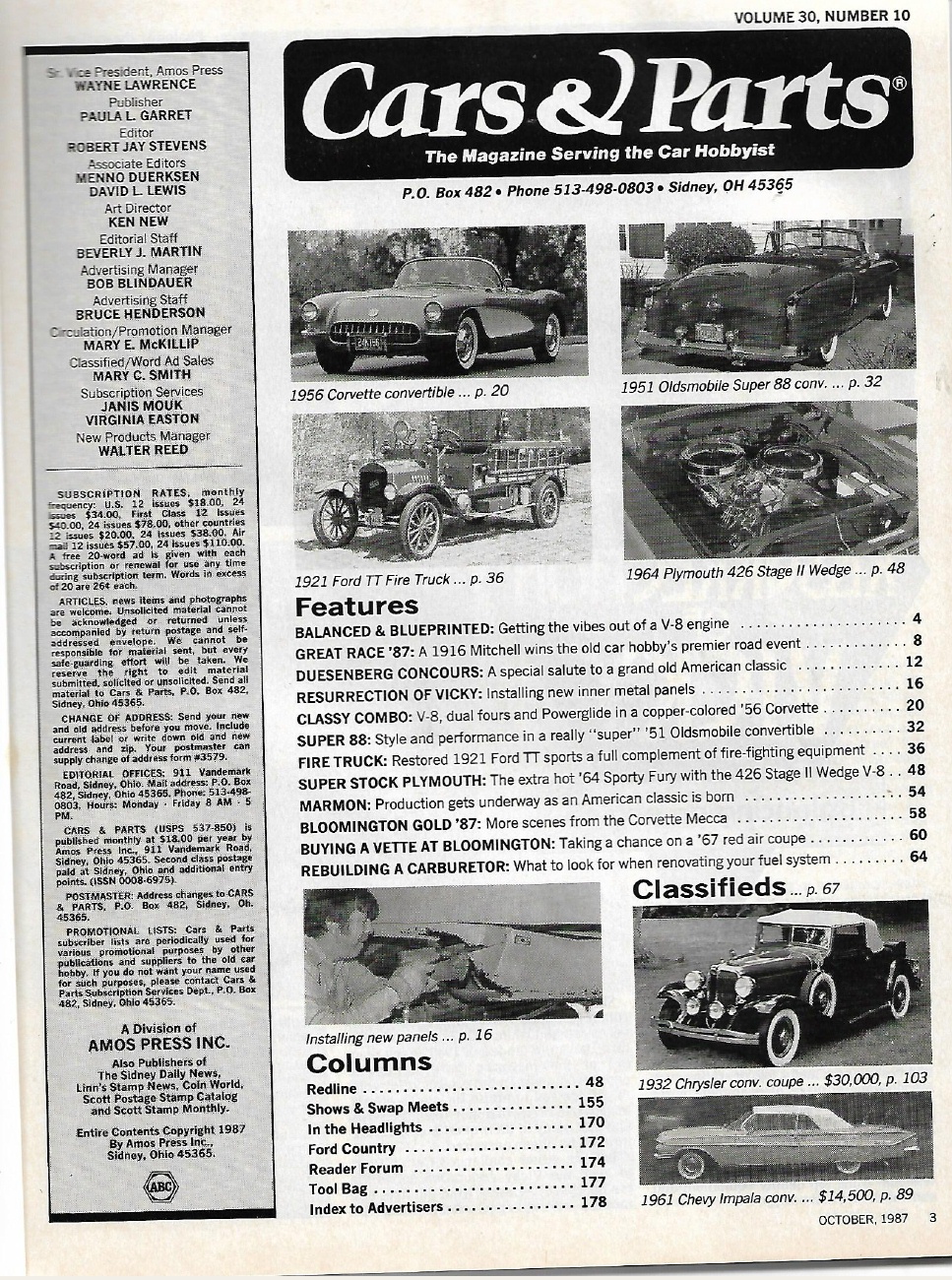 Reviews CARS & PARTS 1987 OCT - '64 SPORT FURY, '56 CORVETTE, '51 OLDS SUPPER 88
