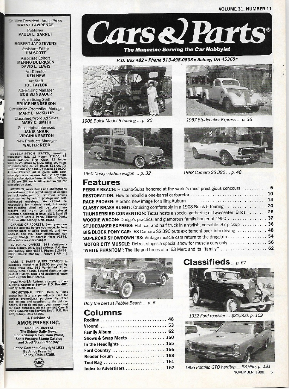 Reviews CARS & PARTS 1988 NOV - '50 DODGE WOODIE, '08 BUICK MODEL 5, '63 MERC, CORD