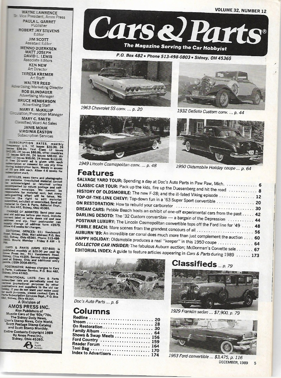 Reviews CARS & PARTS 1989 DEC - '49 LINCOLN COSMO, '63 IMPALA SS, '50 OLDS HOLIDAY