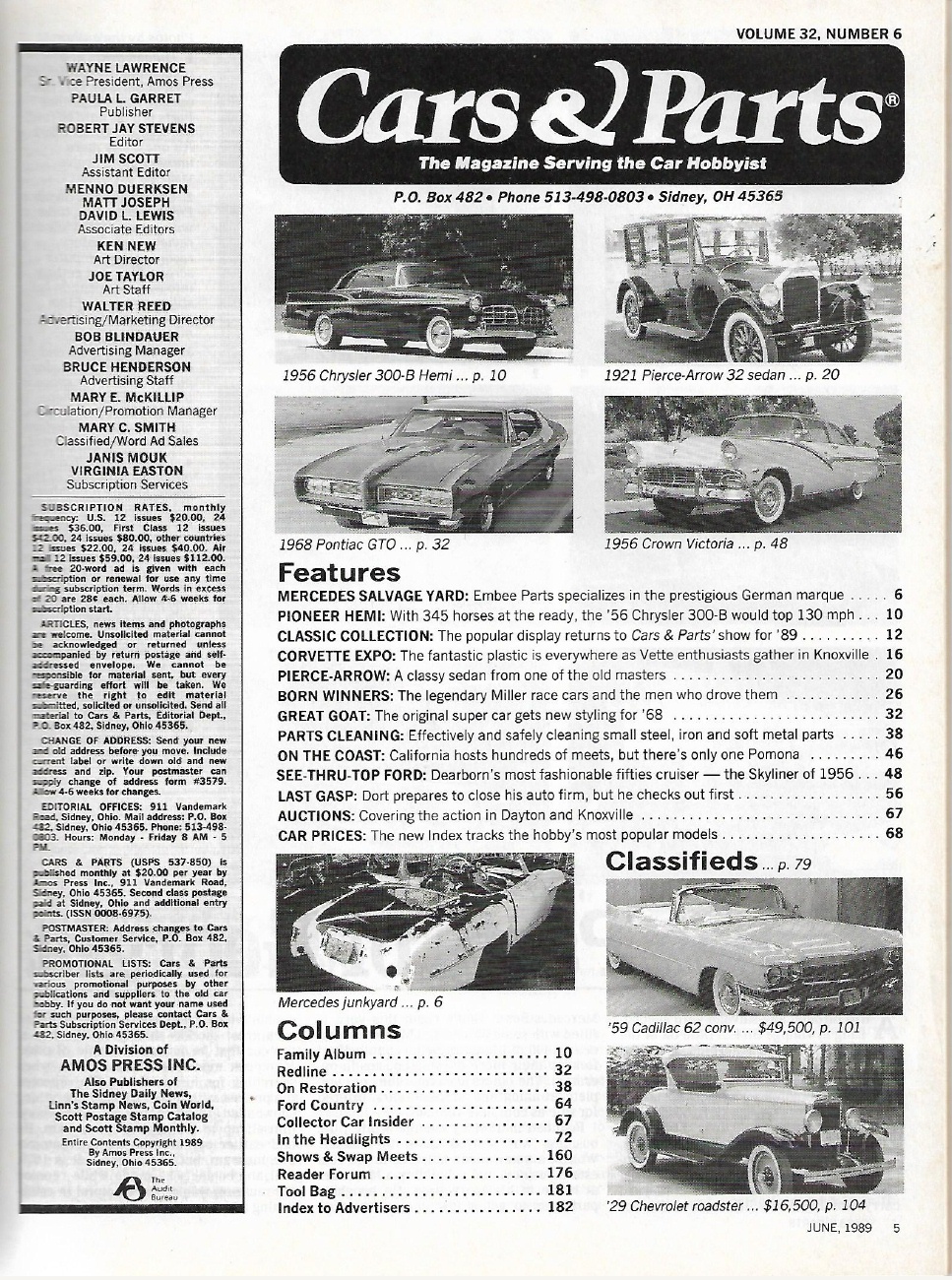 Reviews CARS & PARTS 1989 JUNE - GLASSTOP '56 CROWN VIC, '68 PONTIAC GTO, DORT, MILLER