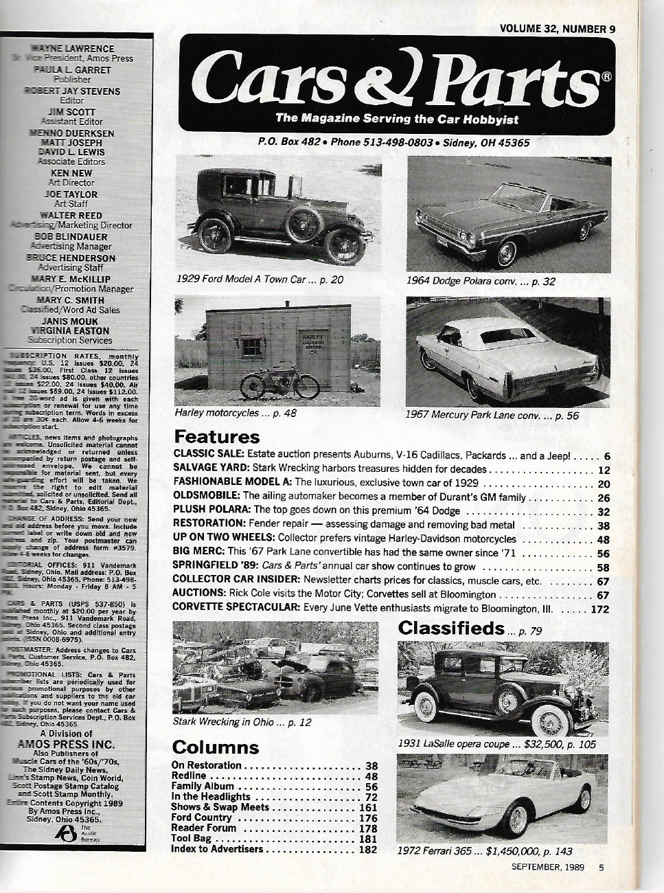 Reviews CARS & PARTS 1989 SEPT - '29 FORD MODEL A, '67 PARK LANE CONV, '64 POLARA