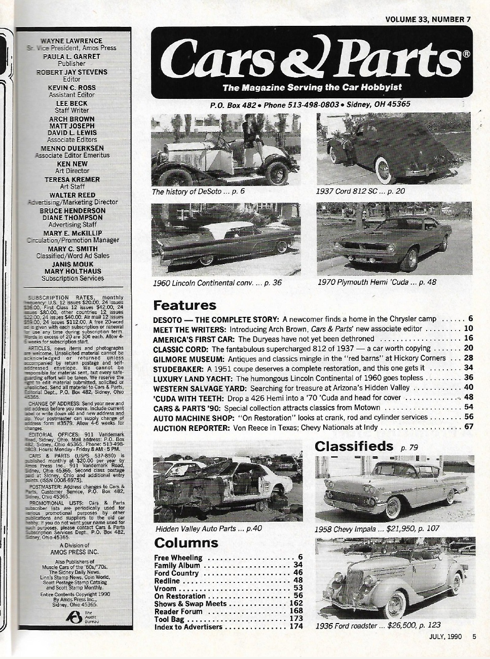 Reviews CARS & PARTS 1990 JULY - HEMI CUDA, '60 LINCOLN, '37 CORD 812, '51 STUDE REGAL