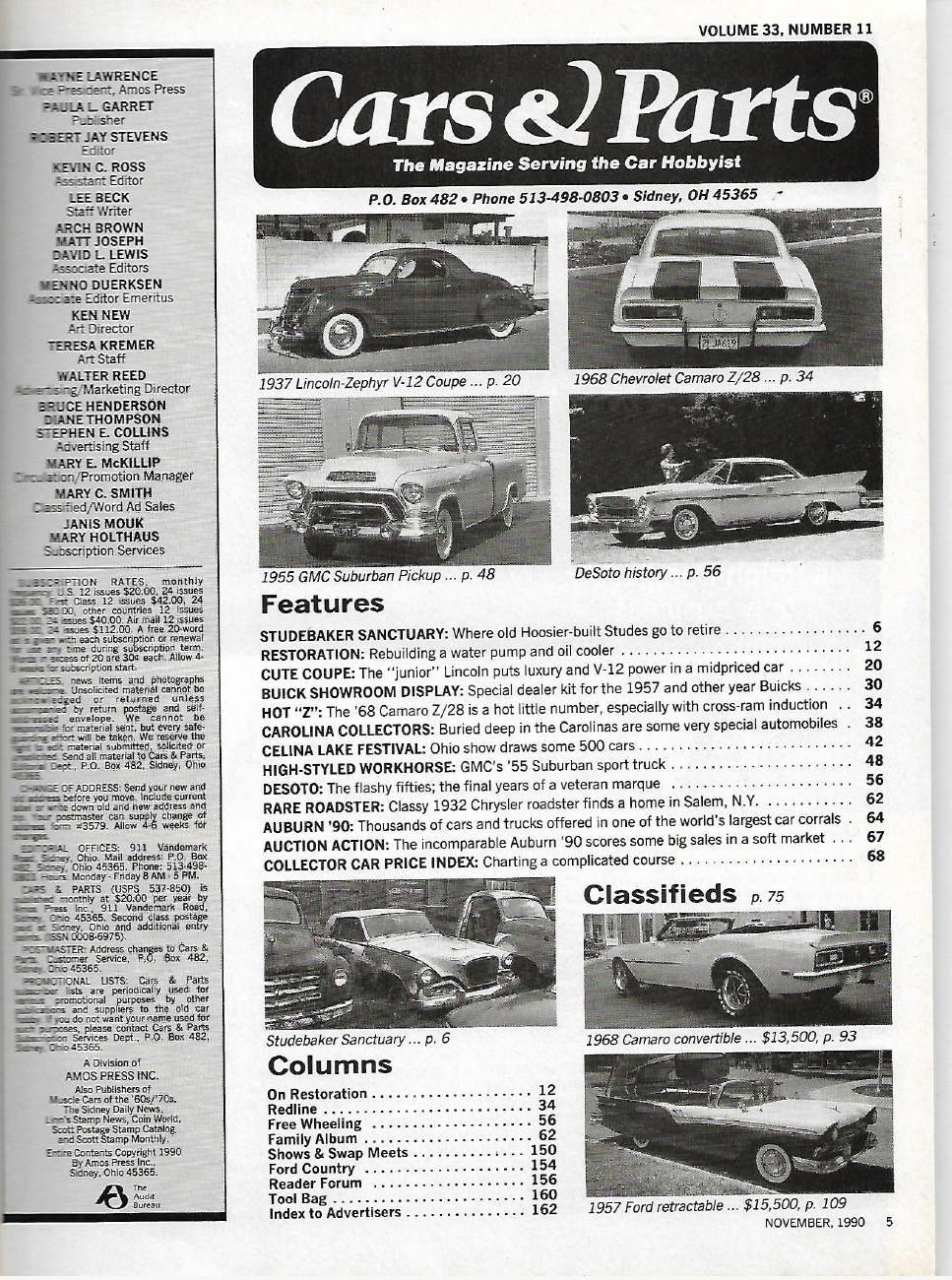 CARS & PARTS 1990 NOV - Z/28 IN '68, '37 LINCOLN-ZEPHYR V-12, '55 SUBURBAN