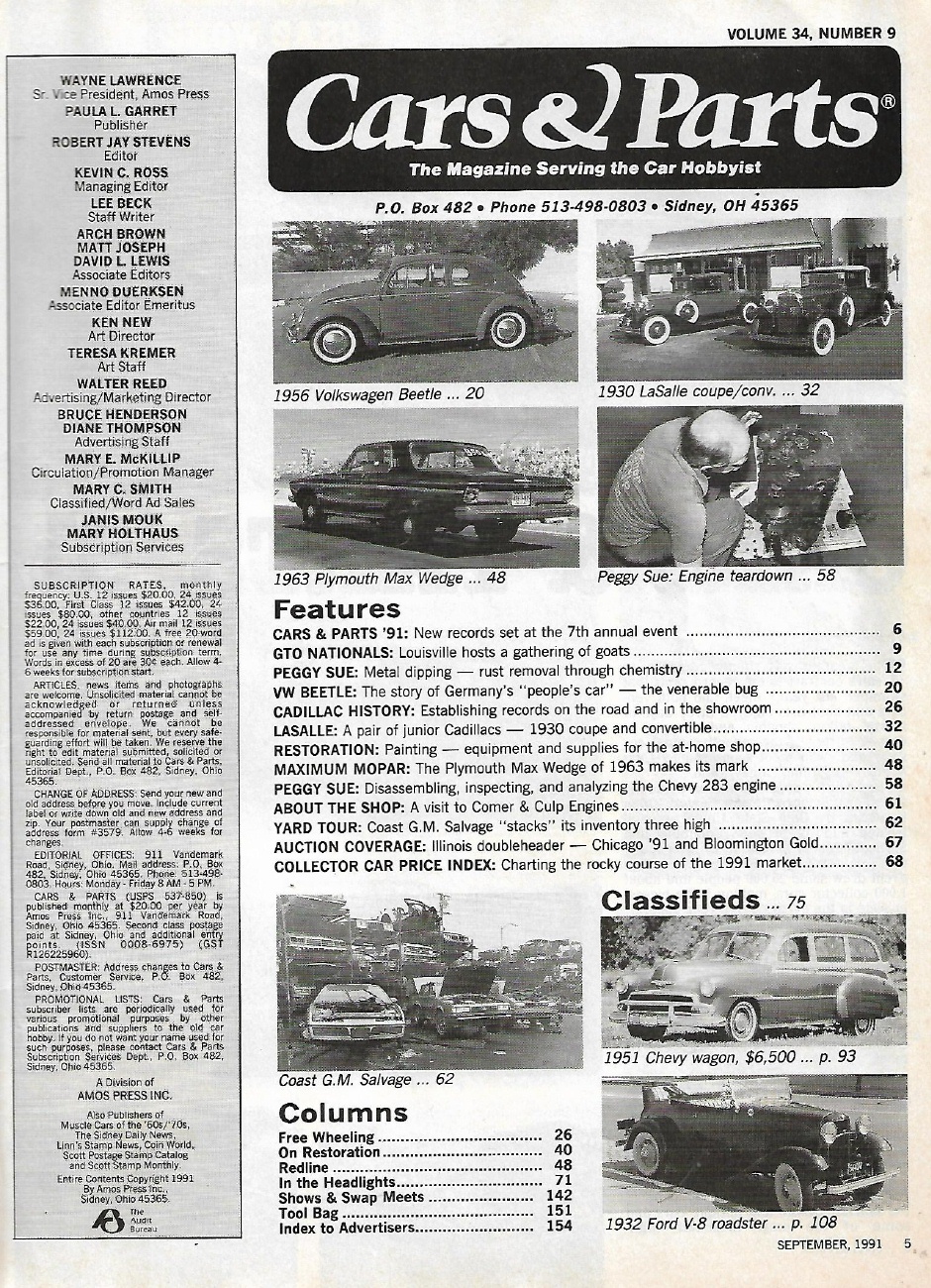 CARS & PARTS 1991 SEPT - '30 LASALLE, CONV COUPE, '63 SPORT FURY, CADILLAC HIST