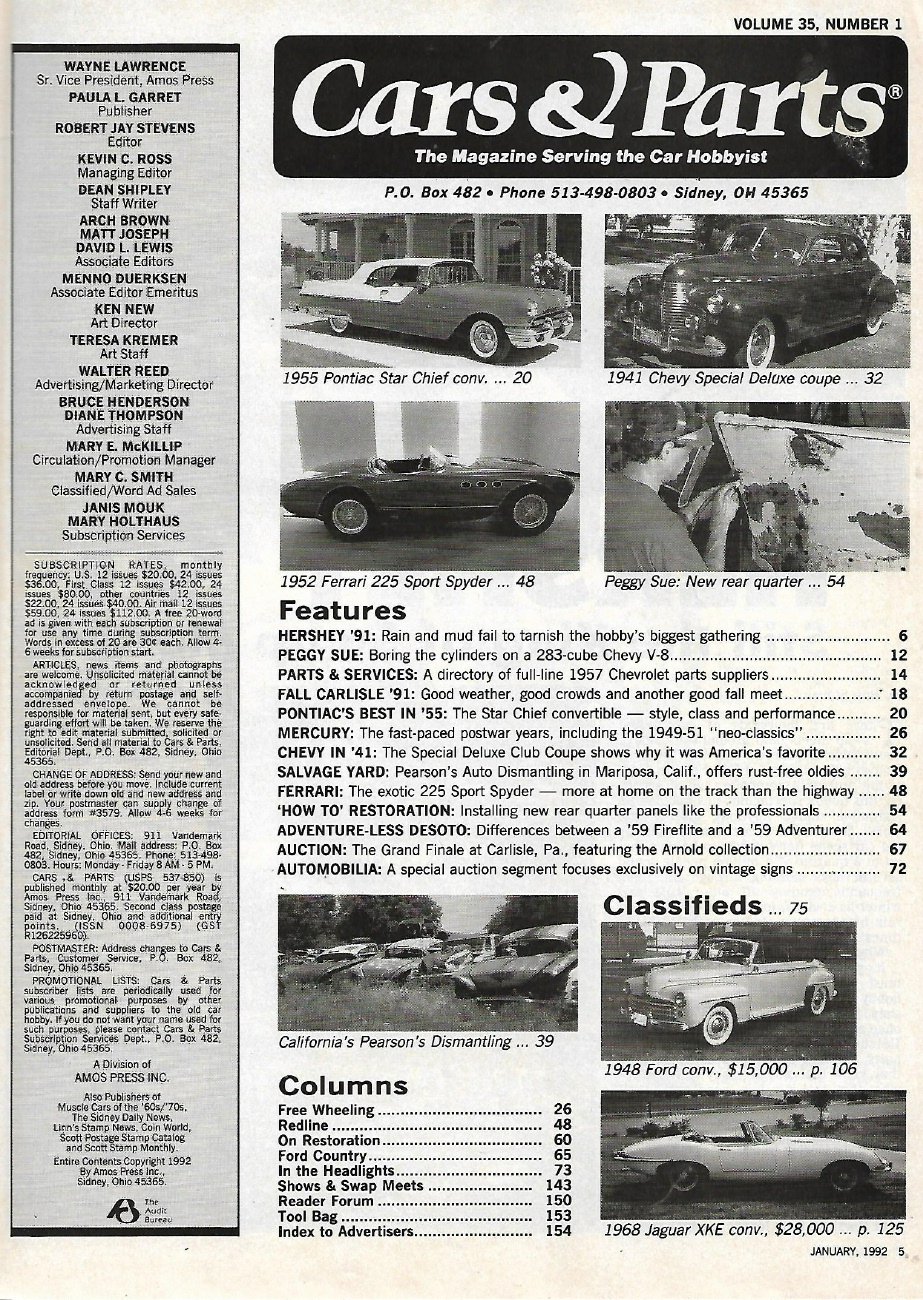 CARS & PARTS 1992 JAN - '52 STAR CHIEF CONV, PEGGY SUE, '52 FERRARI 225 SPORT