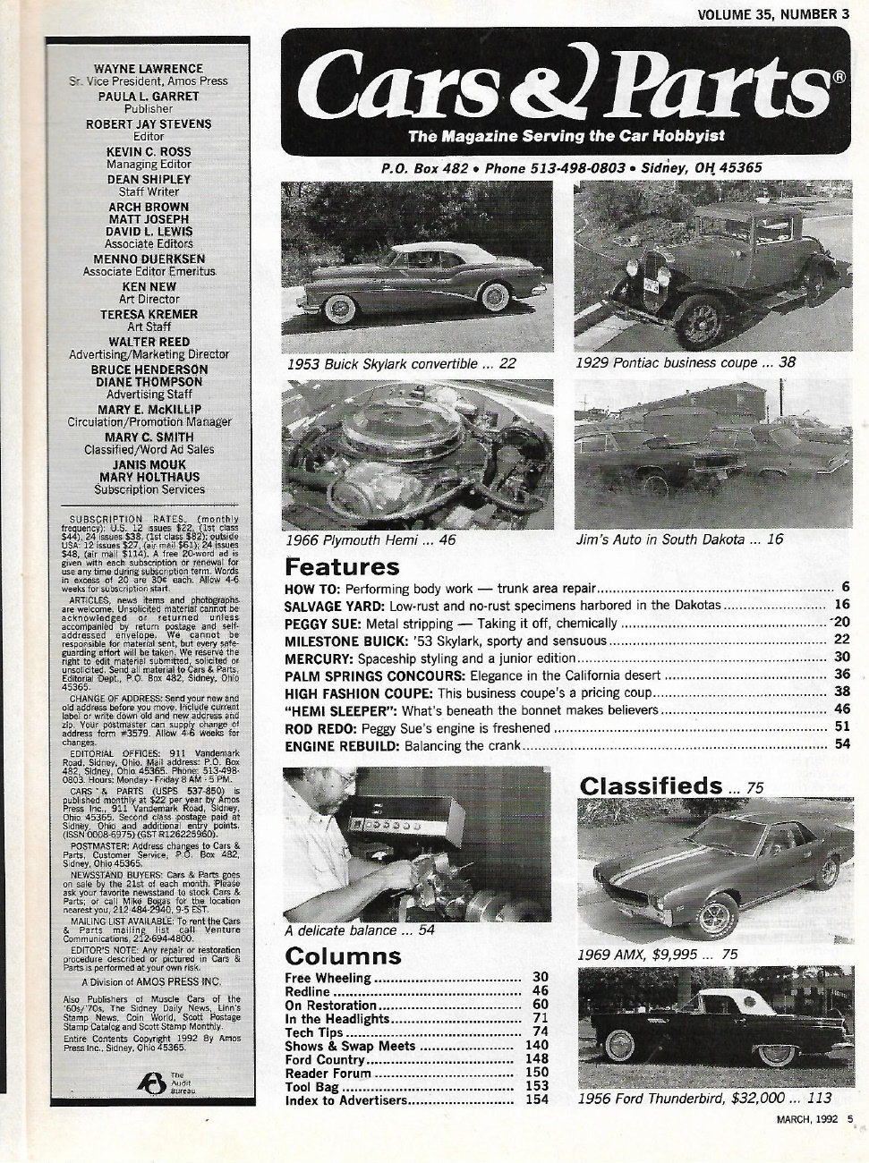 Reviews CARS & PARTS 1992 MAR - '29 PONTIAC COUPE, CRANK BAL 283 CHEVY,'50S MERCURY