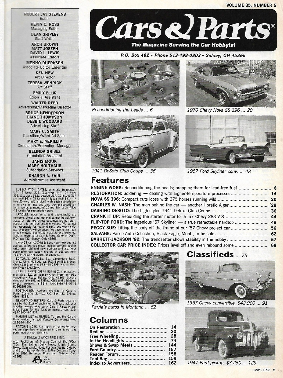 Reviews CARS & PARTS 1992 MAY - '57 SKYLINER RETRACTABLE, '70 NOVA SS 396,'57 RESTO*