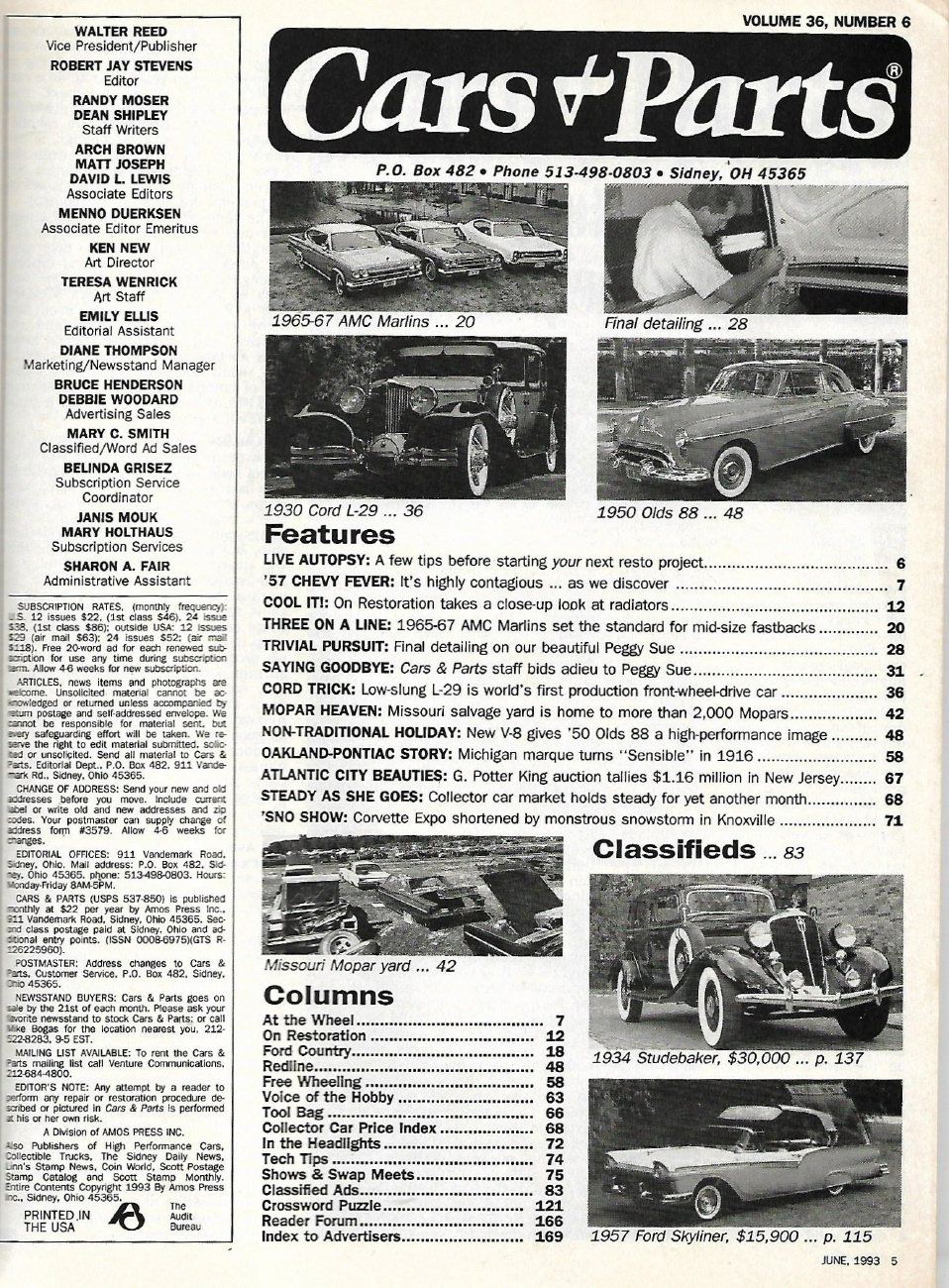 Reviews CARS & PARTS 1993 JUNE - '30 CORD L-29, '50 OLDS 88, BYE PEGGY SUE, AMC MARLIN