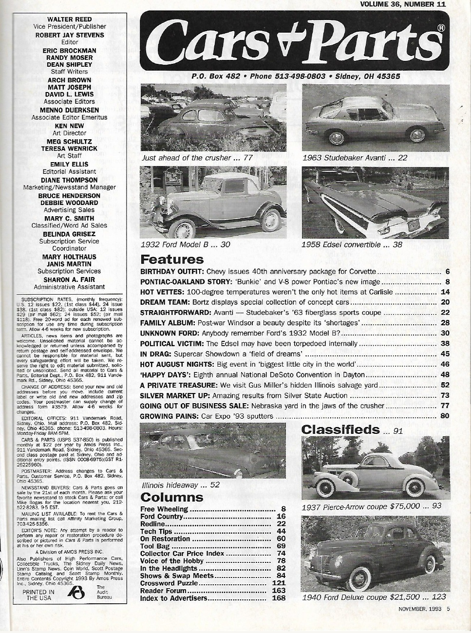 Reviews CARS & PARTS 1993 NOV - STUDEBAKER, '63 AVANTI, '58 EDSEL, '32 FORD MODEL B