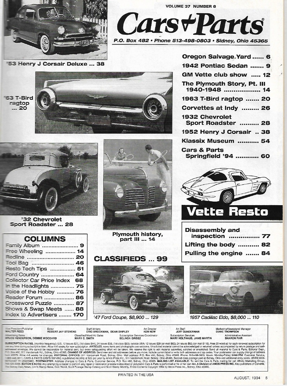 Reviews CARS & PARTS 1994 AUG - '63 THUNDERBIRD, VETTE RESTO, '32 CHEVROLET ROADSTER