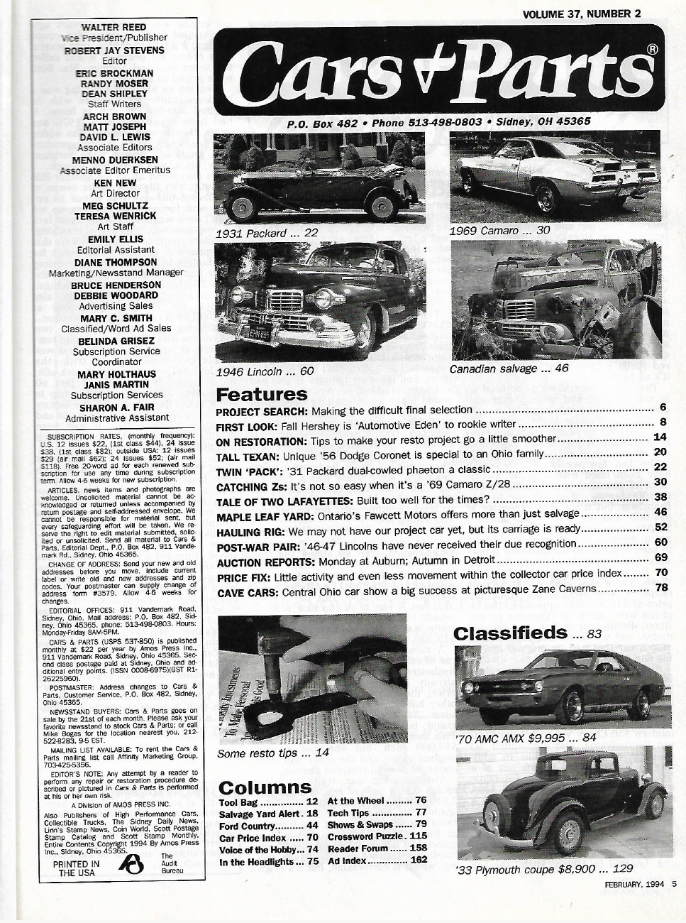 Reviews CARS & PARTS 1994 FEB - '31 PACKARD,LINCOLNS '46/'47, '63 SPLIT WINDOW, '69 Z28