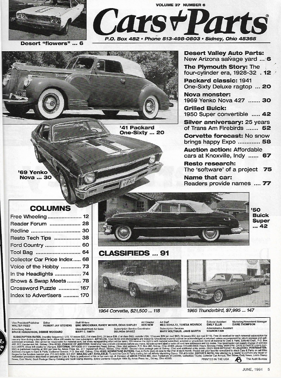 Reviews CARS & PARTS 1994 JUNE - TRANS AM 25TH,'50 BUICK SUPER,'69 YENKO NOVA, PLYMOUTH