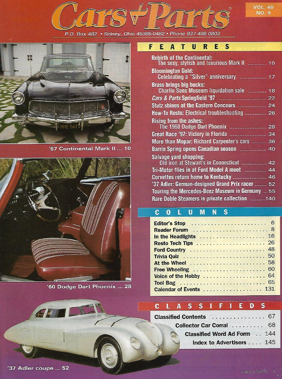 Reviews CARS & PARTS 1997 SEPT - '60 DART PHOENIX, '37 ADLER COUPE, MARK II, KETTERING*