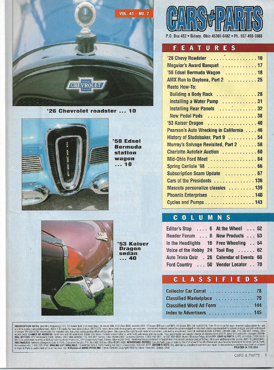 Reviews CARS & PARTS 1998 JULY - '53 KAISER DRAGON, '58 EDSEL BERMUDA WAGON, '26 CHEVY