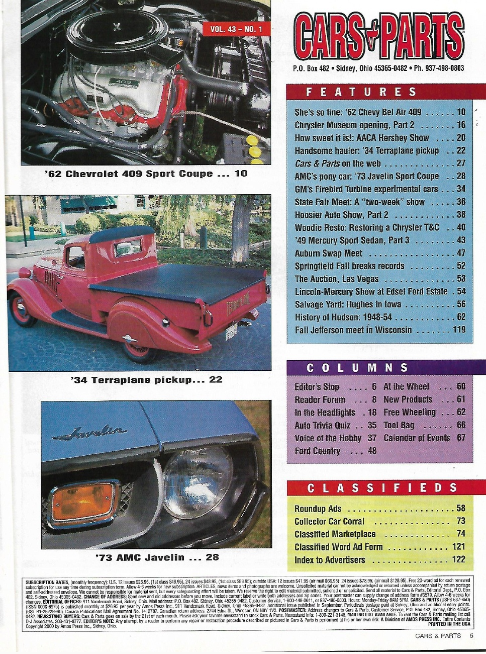 Reviews CARS & PARTS 2000 JAN - '73 JAVELIN, '46 TOWN & COUNTRY, TERRAPLANE, BEL AIR