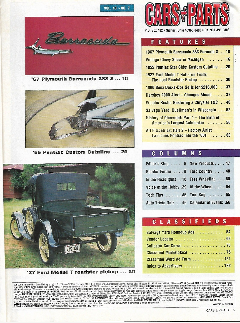 Reviews CARS & PARTS 2000 JULY - '67 BARRACUDA S, '55 CATALINA, '27 FORD HALF-TON