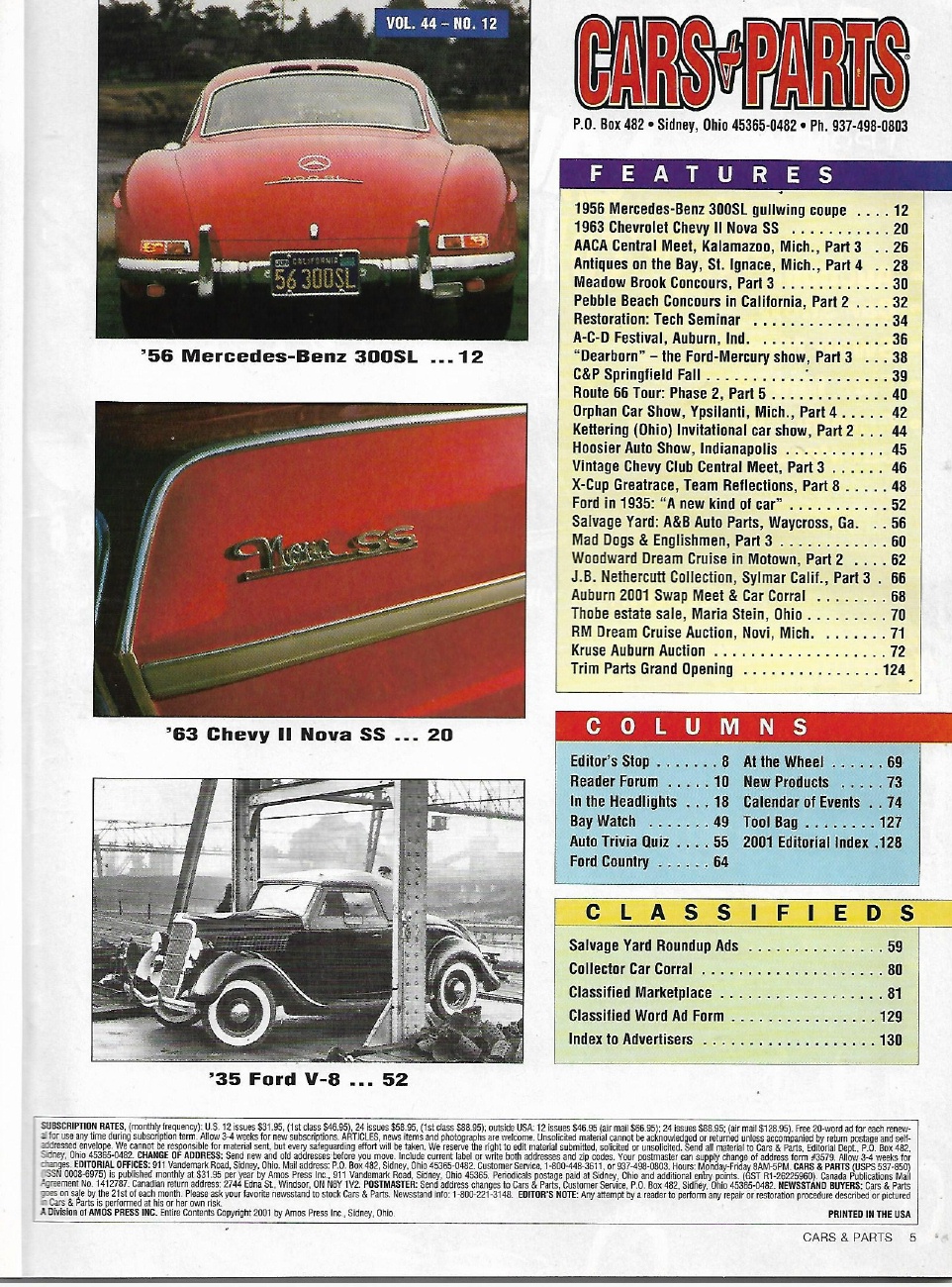 Reviews CARS & PARTS 2001 DEC - '63 NOVA SS, '35 FORD, '56 MERCEDES-BENZ 300SL,ROUTE 66