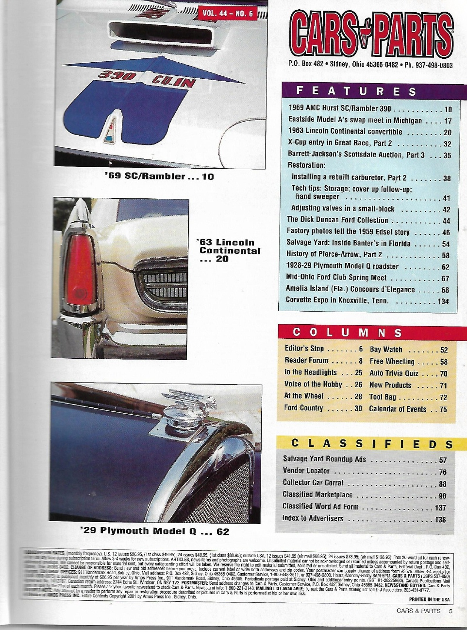 Reviews CARS & PARTS 2001 JUNE - '63 CONTINENTAL 4DR RAGTOP, '69 S/C RAMBLER 390, EDSEL