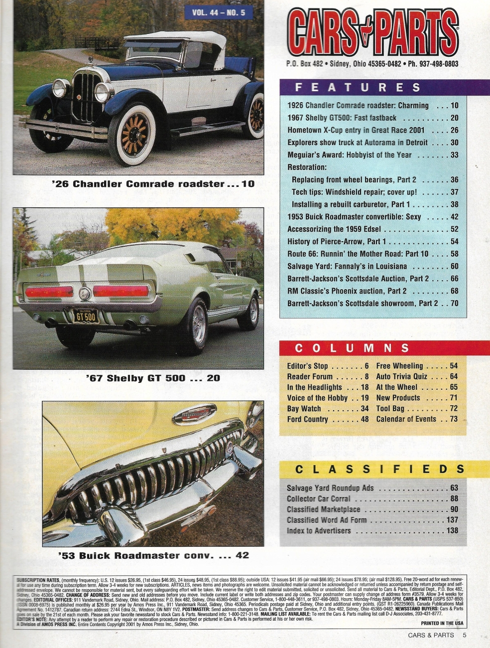 Reviews CARS & PARTS 2001 MAY - '67 GT 500 SHELBY, 53 BUICK RAGTOP, 26 CHANDLER COMRADE