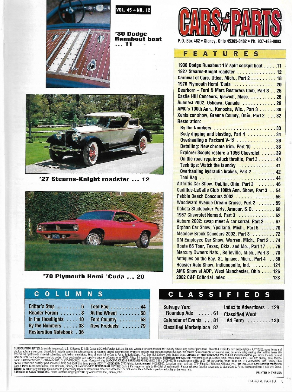 Reviews CARS & PARTS 2002 DEC - '70 HEMI CUDA, '27 STEARNS-KNIGHT 6, PACKARD V-12 REDO