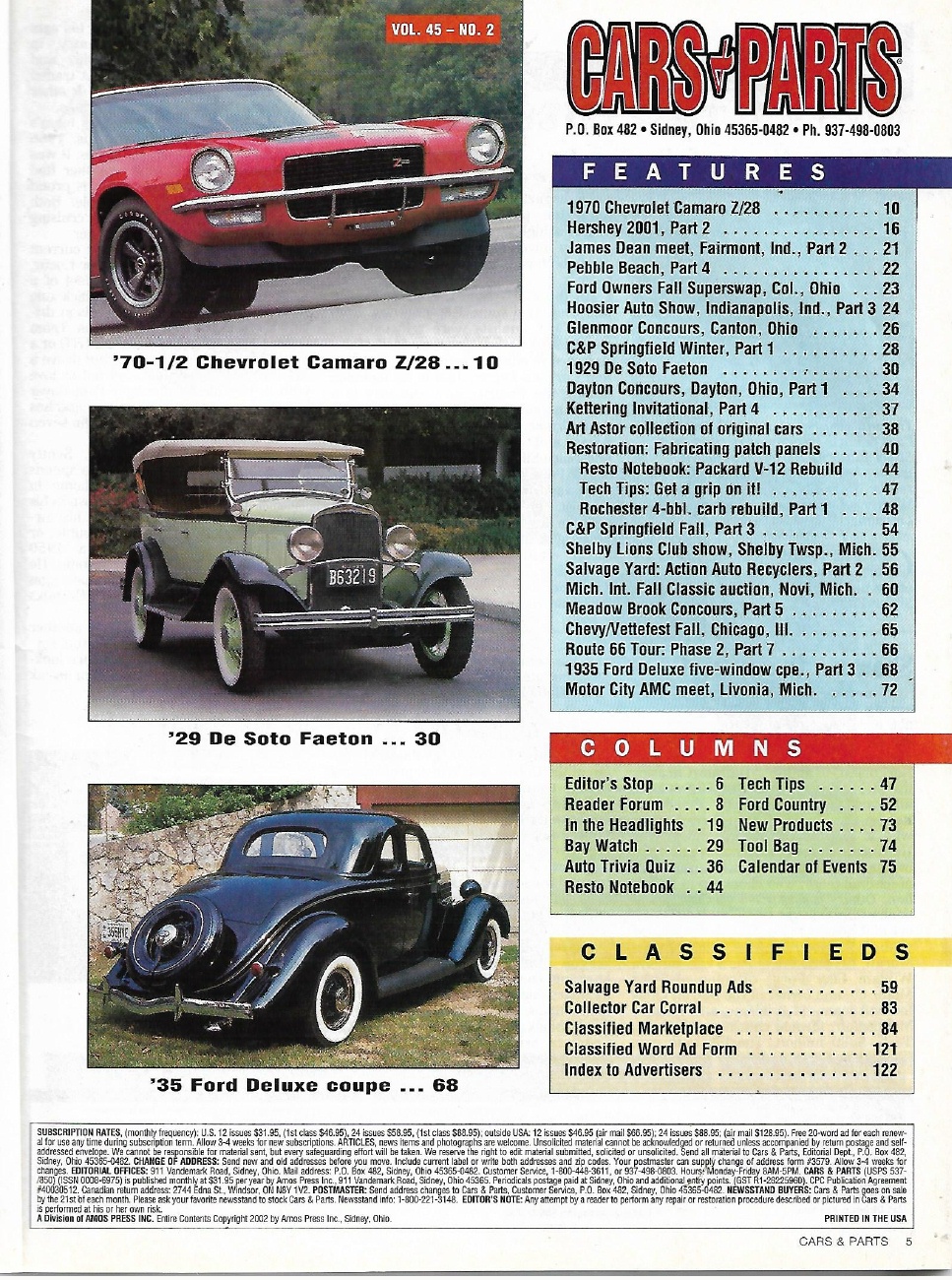 Reviews CARS & PARTS 2002 FEB - '70-1/2 CAMARO Z/28, '35 FORD COUPE, '20 DESOTO FAETON