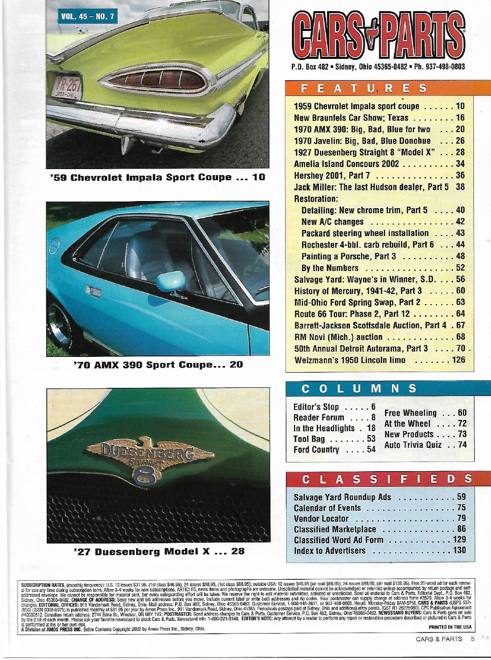 Reviews CARS & PARTS 2002 JULY - '59 IMPALA, '70 AMX 390, '70 AMC JAVELIN, MERCURY HIST*