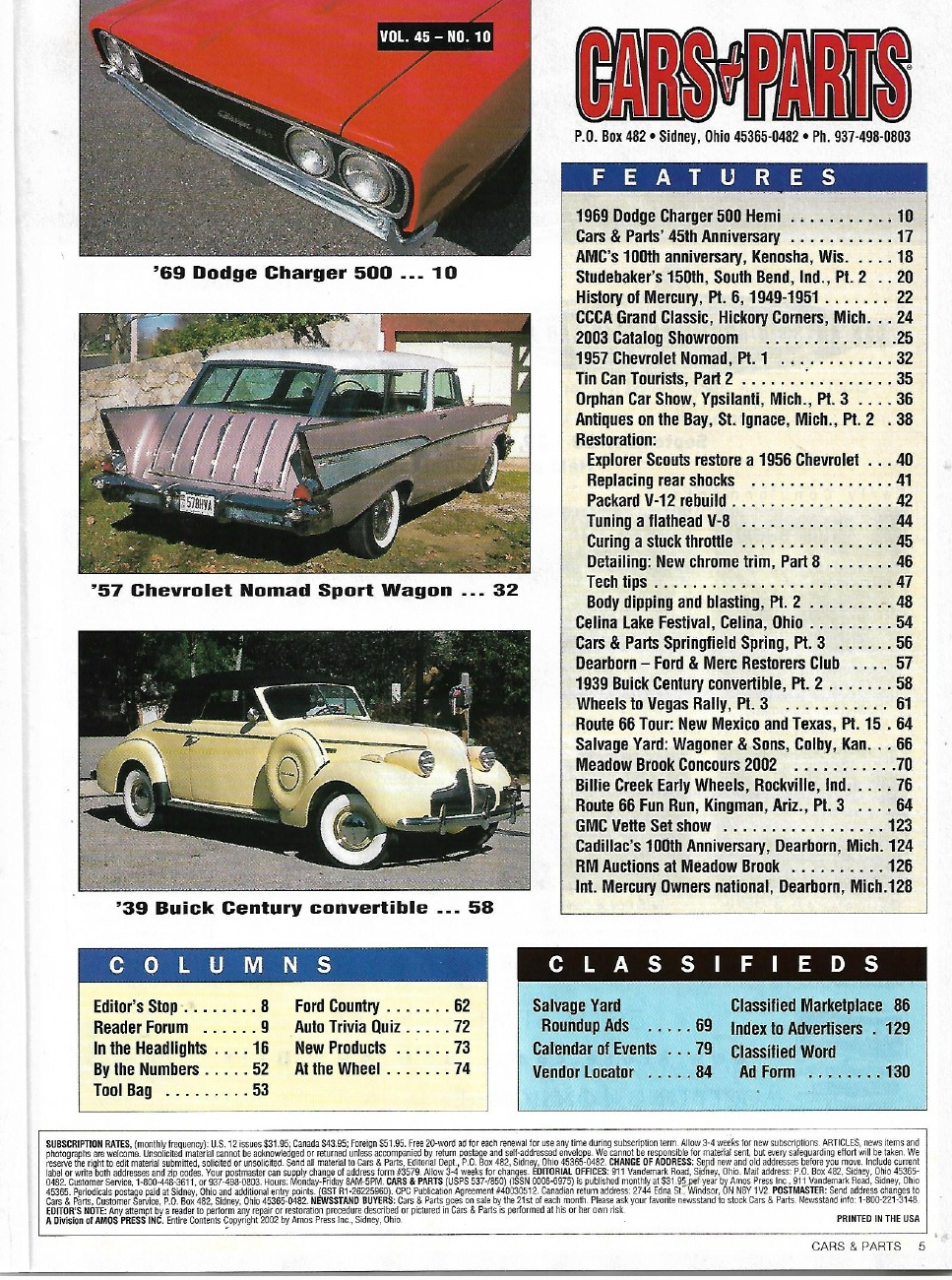 Reviews CARS & PARTS 2002 OCT - '69 DODEGE CHARGER 500 HEMI, '57 NOMAD, '39 BUICK CENT*