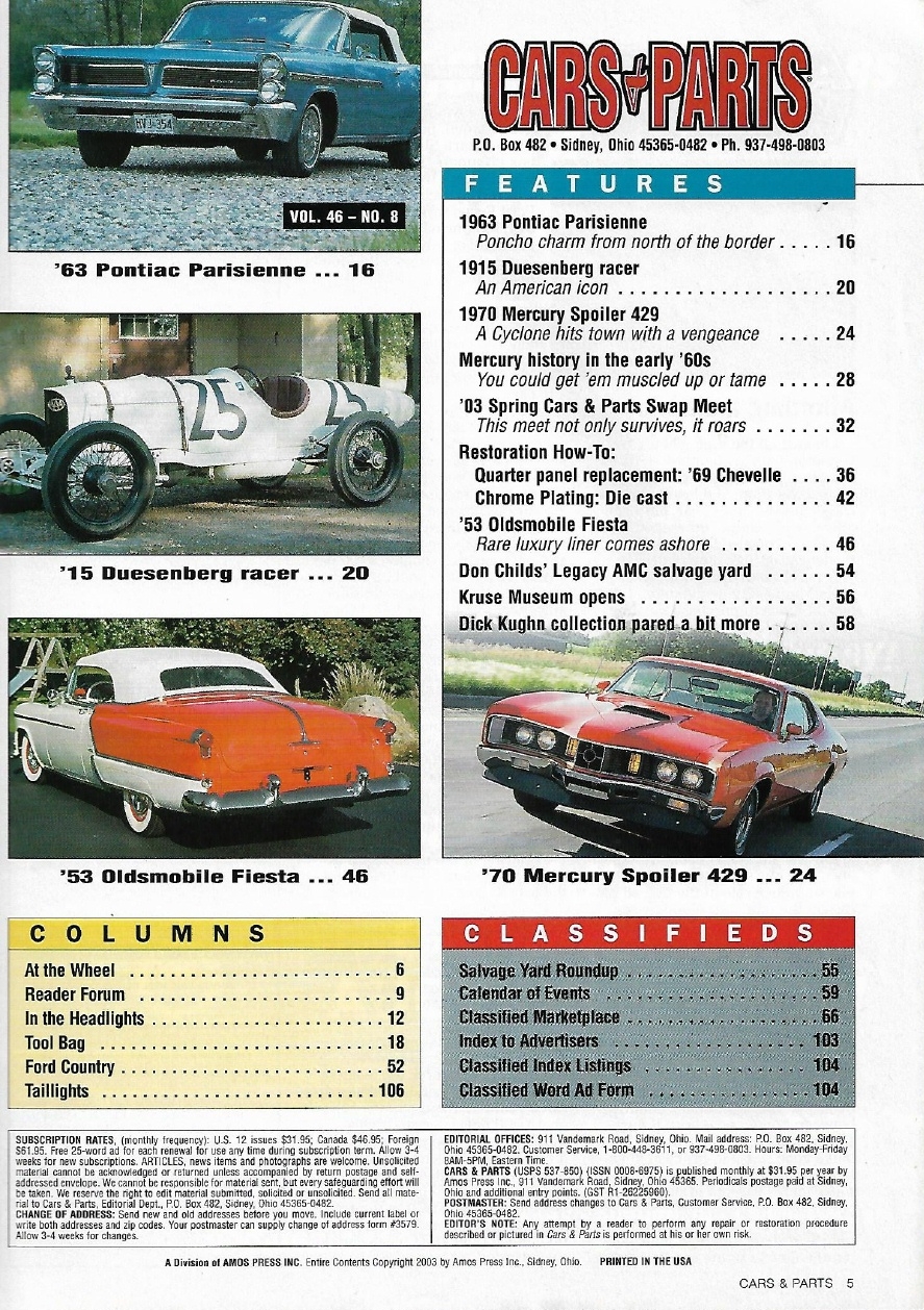 Reviews CARS & PARTS 2003 AUG - '70 CYCLONE SPOILER 429 CJ, '53 OLDS FIESTA