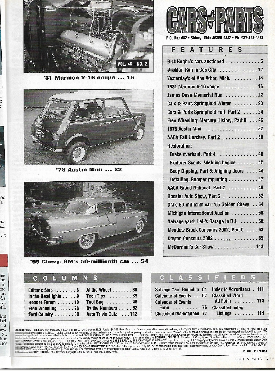 Reviews CARS & PARTS 2003 FEB - '31 MARMON V-16, 'GOLD '55 CHEVY, '78 AUSTIN MINI