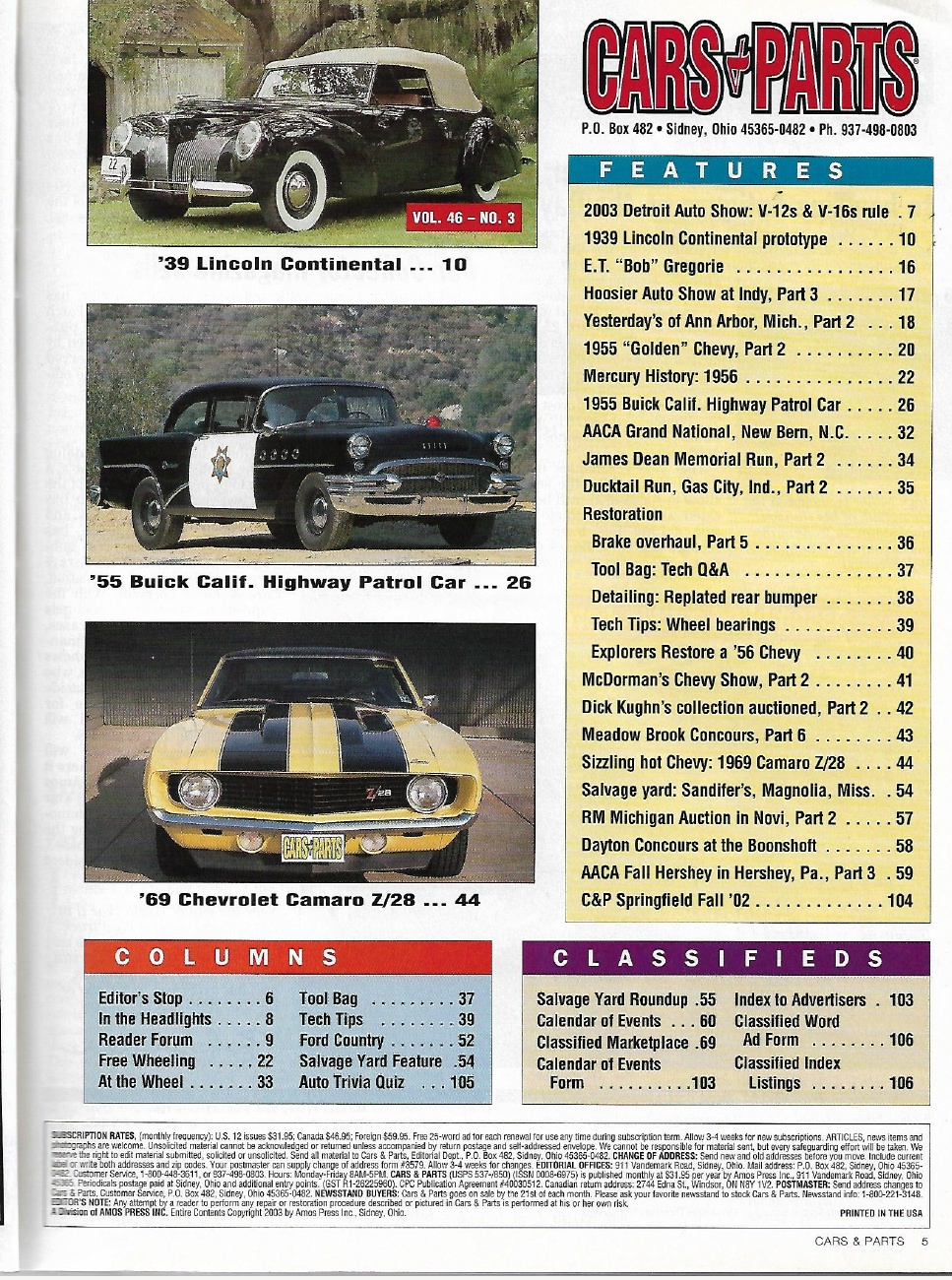 Reviews CARS & PARTS 2003 MAR - '69 CAMARO Z/28, '55 BUICK CALIF HIGHWAY PATROL CAR