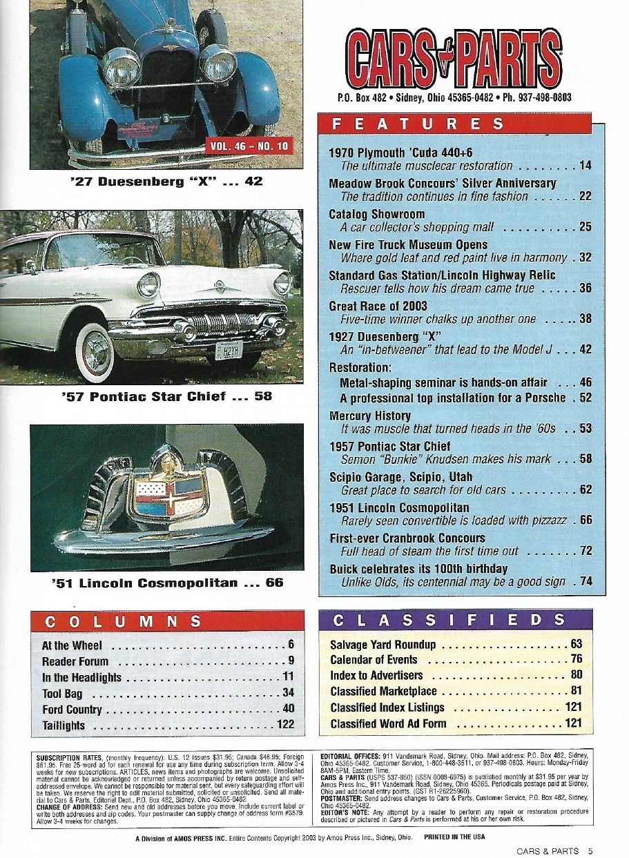 Reviews CARS & PARTS 2003 OCT - FIRE TRUCK MUSEUM, '70 'CUDA 440+6, '57 STAR CHIEF