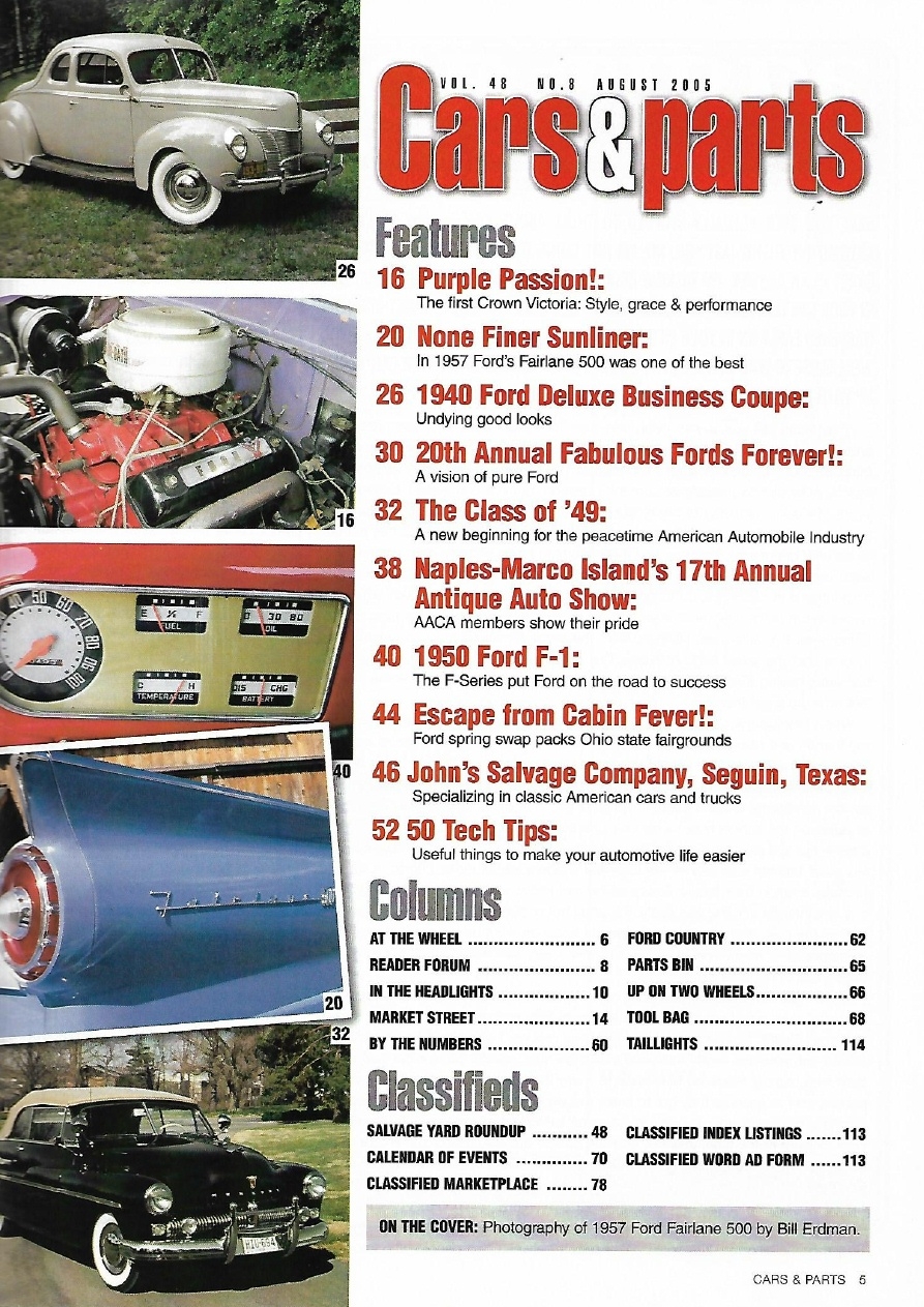 Reviews CARS & PARTS 2005 AUG - '40 FORD DELUXE, '57 FAIRLANE 500, '55 CROWN VIC
