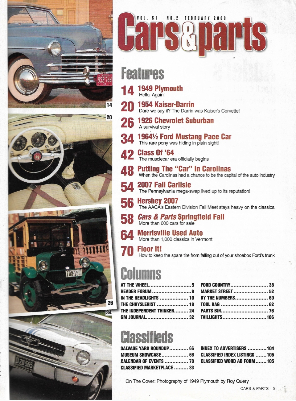 Reviews CARS & PARTS 2008 FEB - '26 SUBURBAN, '54 KAISER-DARRIN, '64 1/2 MUSTANG PACE