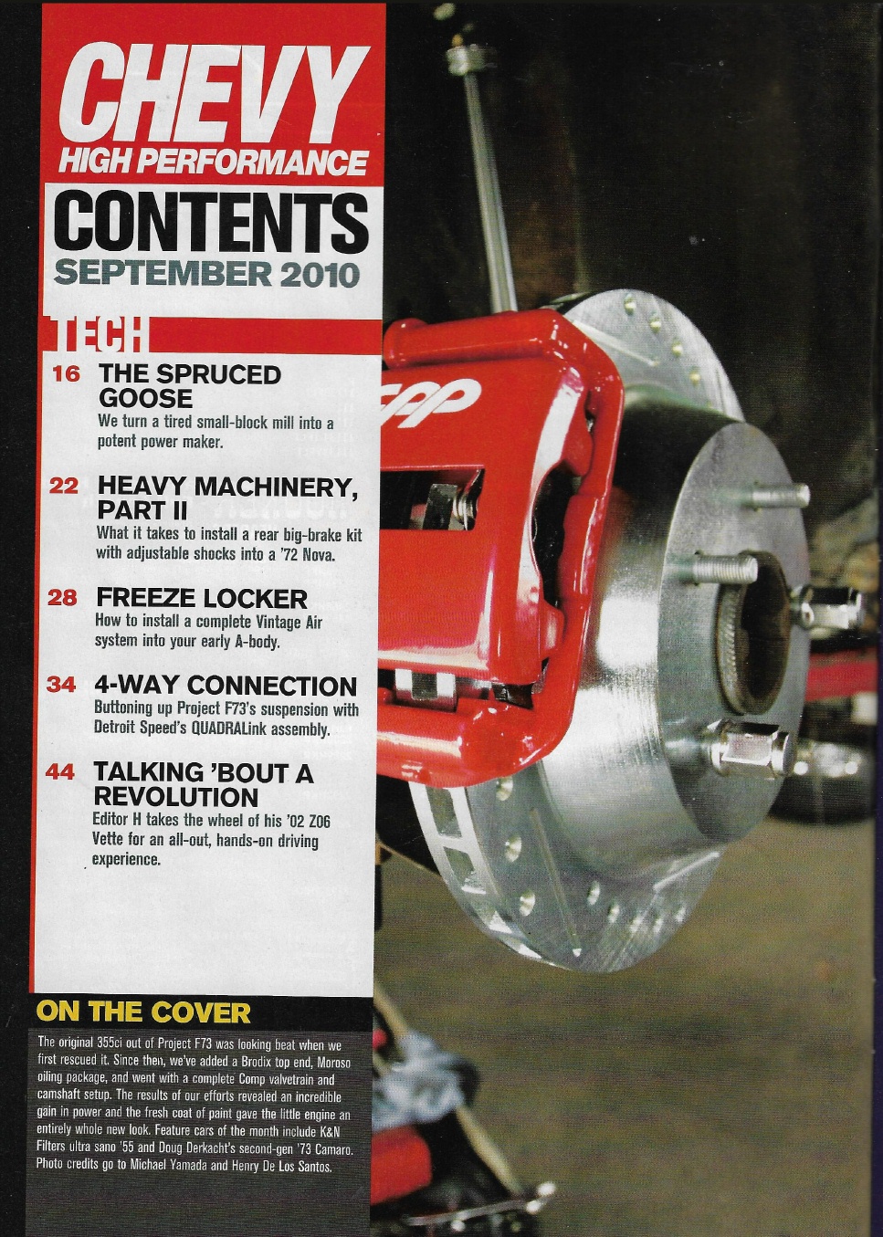 Reviews CHEVY HIGH PERFORMANCE 2010 SEPT - TRI-FIVE, PROJ F73, '02 Z06 VETTE, '72 NOVA