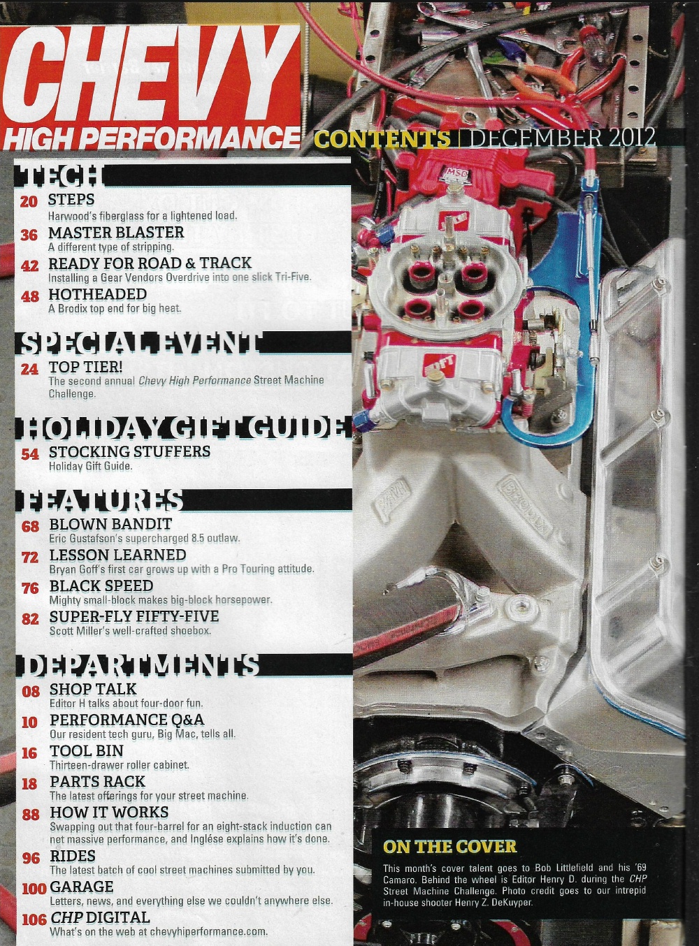 CHEVY HIGH PERFORMANCE 2012 DEC - GEARS, 8 STACK INDUCTION, FIBER HOODS, DECKS