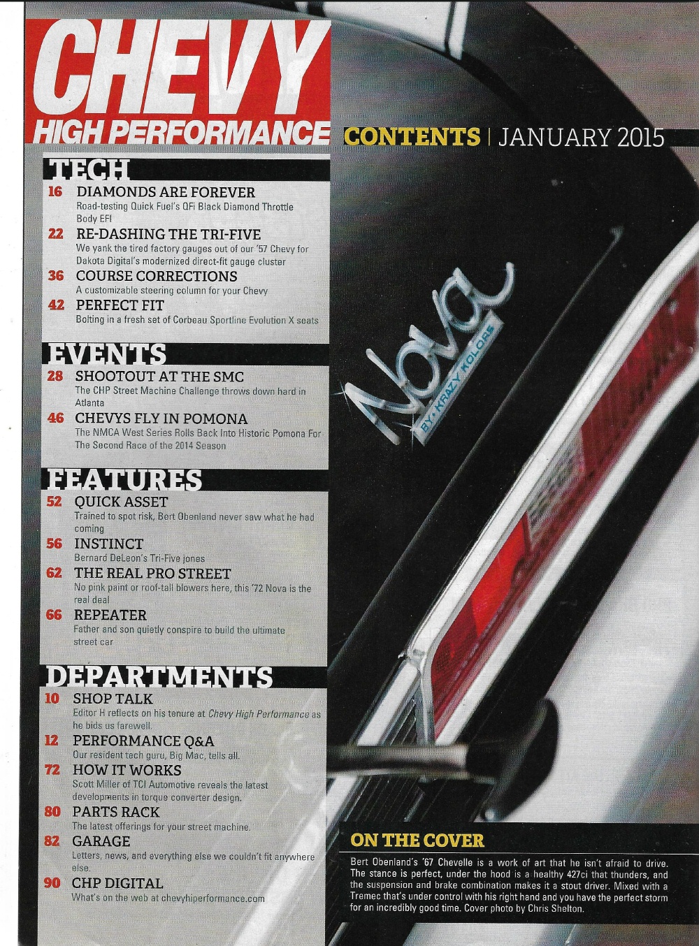 Reviews CHEVY HIGH PERFORMANCE 2015 JAN - OBENLAND'S PUNCH, QFI FI BOLT-ON, TRI 5 DASH*